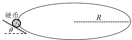 (2)如图(b),高铁内有一倾角为 θ 的桌面,其横截面为楔形且竖直;硬币面与此横截面平行,硬币边缘 P 点仍与桌面接触,硬币重心仍在过 P 点的直径的右侧。此时高铁在水平圆轨道上匀速运行,硬币面过轨道直径,硬币重心做圆周运动的半径为 R。已知硬币相对于桌面静止,求