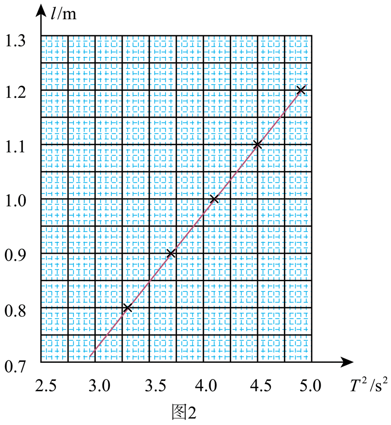 (3)选取不同的摆线长度重复上述实验,相关数据汇总在下表中,在坐标纸上作出摆线长度(l)和单摆周期的二次方(T2)的关系曲线,如图 2 所示。