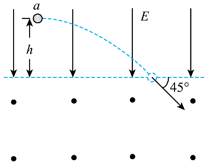 15.如图,在水平虚线上方区域有竖直向下的匀强电场,电场强度大小为 E,在虚线下方区域有垂直纸面向外的匀强磁场。质量为 m、电荷量为 q(q > 0)的粒子从距虚线高度为 h 的 a 点向右水平发射,当粒子进入磁场时其速度方向与水平虚线的夹角为 45°。不计重力。