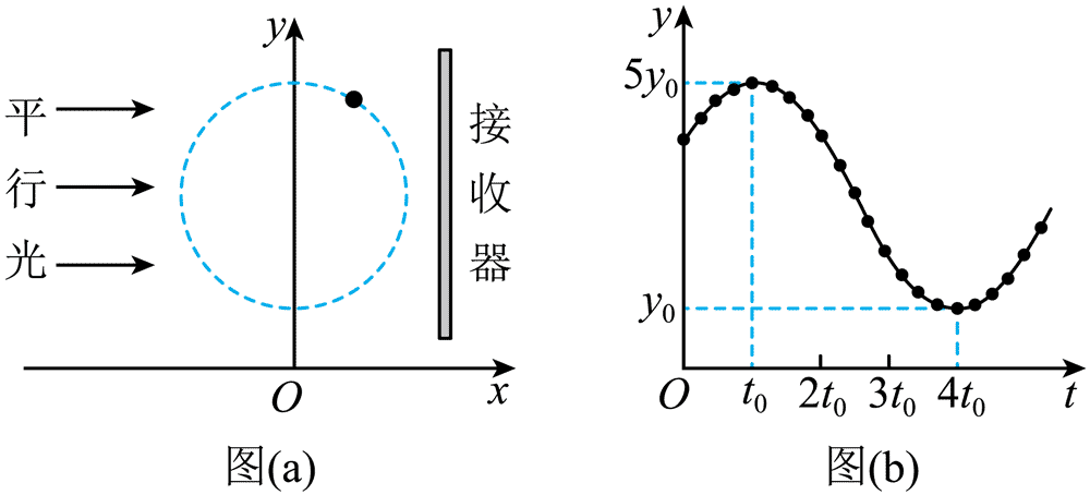 7.如图(a),在光滑绝缘水平桌面内建立直角坐标系 Oxy,空间内存在与桌面垂直的匀强磁场。一质量为 m、带电量为 q 的小球在桌面内做圆周运动。平行光沿 x 轴正方向照射,垂直光照方向放置的接收器记录小球不同时刻的投影位置。投影坐标 y 随时间 t 的变化曲线如图(b)所示,则( )