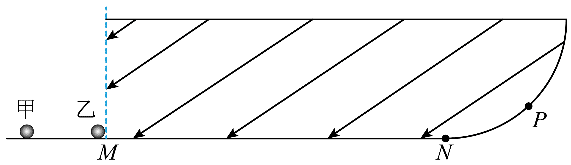 10.如图,在竖直平面内,一水平光滑直导轨与半径为 2L 的光滑圆弧导轨相切于 N 点,M 点右侧有平行导轨面斜向左下的匀强电场。不带电小球甲以 5\(\sqrt {gL} \) 的速度向右运动,与静止于 M 点、带正电小球乙发生弹性正碰。碰撞后,甲运动至 MN 中点时,乙恰好运动至 N 点,之后乙沿圆弧导轨最高运动至 P 点,不考虑此后的运动。已知甲、乙的质量比为 4∶1,M、N 之间的距离为 6L,弧 NP 的圆心角为 45°,重力加速度大小为 g,全程不发生电荷转移。乙从 M 运动到 N 的过程( )