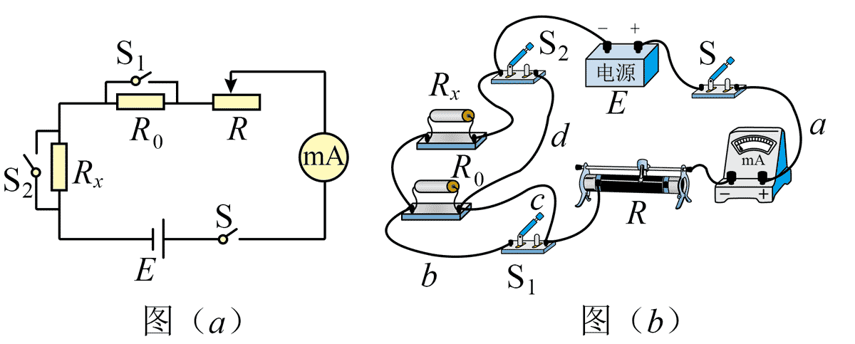 11.某同学为测量待测电阻 Rx 的阻值,设计了如图(a)所示的电路。所用器材有:毫安表(量程 0 ~ 100 mA)、定值电阻 R0(阻值 25 Ω)、滑动变阻器 R、电源 E、开关和导线若干。