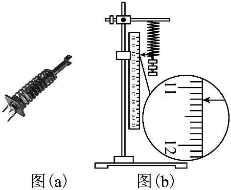 12.某兴趣小组看到一种由两根弹簧嵌套并联组成的减振器,如图(a)所示。他们讨论得出劲度系数分别为 kA、kB 的两根弹簧并联时,等效劲度系数 kAB = kA + kB。为了验证该结论,小组选用两根原长相等、粗细不同的弹簧 A、B,设计实验进行验证。如图(b),弹簧上端固定,毫米刻度尺固定在弹簧一侧。逐一增挂钩码,记下每次指针稳定后所指的刻度尺示数 x 和对应钩码的总质量 m,并计算弹簧弹力 F(取重力加速度大小 g = 9.8 m/s2)。