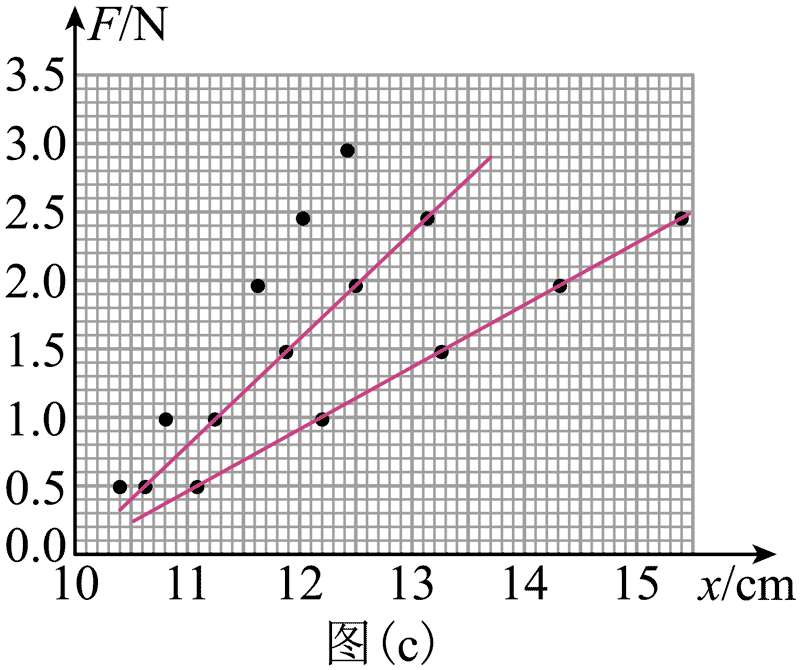 以刻度尺读数 x 为横坐标,弹簧弹力 F 为纵坐标,利用表中数据,作出 F–x 图像,如图(c)所示。回答以下问题: