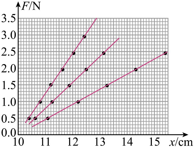 (2)在图(c)坐标纸上作出弹簧 A、B 的 F–x 图线,计算可得劲度系数分别为 kA = 45.6 N/m,kB = 77.9 N/m。在图(c)坐标纸上,补齐读出的数据点,并作出并联弹簧 AB 的 F–x 图线;由作出的图线可得 kAB = ______N/m(结果保留至整数)。