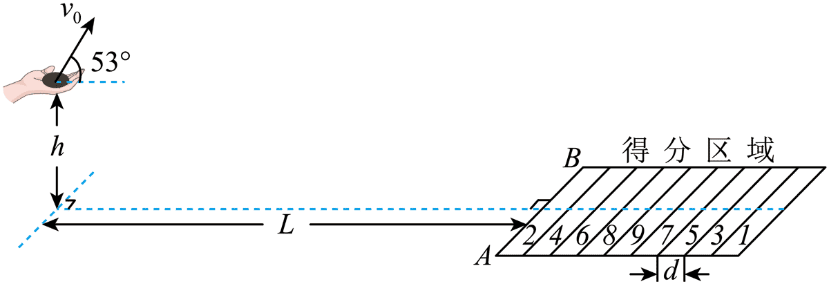 13.投沙包游戏规则为:参赛者站在离得分区域边界 AB 一定的距离外将沙包抛出,每个得分区域的宽度 d = 0.15 m,根据沙包停止点判定得分。如图,某同学以大小 v0 = 5 m/s、方向垂直于 AB 且与水平地面夹角 53° 的初速度斜向上抛出沙包,出手点距 AB 的水平距离 L = 2.7 m,距地面的高度 h = 1 m。落地碰撞瞬间竖直方向速度减为零,水平方向速度减小。落地后沙包滑行一段距离,最终停在 9 分、7 分得分区的分界线上。已知沙包与地面的动摩擦因数 μ = 0.25,sin53° = 0.8,cos53° = 0.6,取重力加速度大小 g = 10 m/s2,空气阻力不计。求: