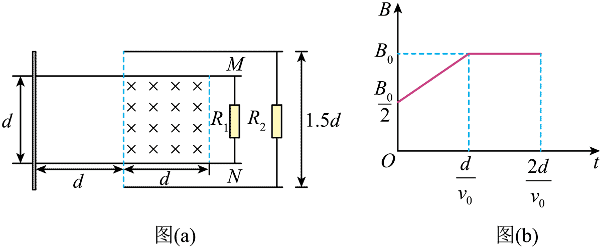 14.如图(a),两组平行金属导轨在同一水平面固定,间距分别为 d 和 1.5d,分别连接电阻 R1、R2,边长为 d 的正方形区域存在竖直向下的匀强磁场,磁感应强度 B 随时间 t 变化关系如图(b)所示。t = 0 时,在距磁场左边界 d 处,一长为 1.5d 的均匀导体棒在外力作用下,以恒定速度 v0 向右运动,直至通过磁场,棒至磁场左边界时与两组导轨同时接触。导体棒阻值为 3R,R1、R2 的阻值分别为 2R、R,其他电阻不计,棒与导轨垂直且接触良好。求: