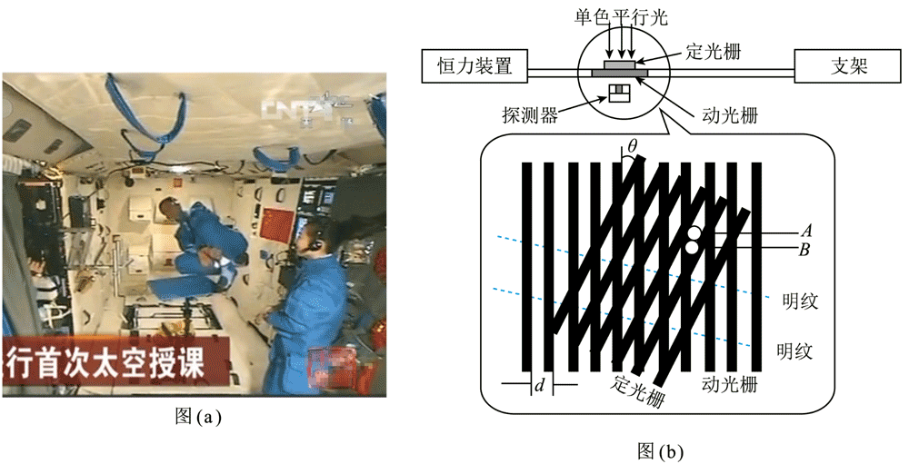 15.如图(a),我国航天员太空授课时演示了质量的测量实验。图(b)为测量装置示意图及光栅尺的放大图,其中单色平行光源、定光栅与光电探测器保持固定;右侧的支架与动光栅在恒力 F 作用下向左做匀加速直线运动,支架与动光栅的总质量为 m0,光栅尺由空间周期皆为 d 的定光栅与动光栅组成。两光栅透光部分宽度相等,光栅面平行,刻线间有一微小夹角 θ。平行光垂直透过光栅尺后形成的周期性图样,称为莫尔条纹,相邻虚线间距为莫尔条纹的空间周期。沿莫尔条纹移动方向,在 A、B 两点放置两个探测器,A、B 间距为 \(\frac{1}{4}\) 莫尔条纹空间周期。由于 θ 很小,动光栅的微小位移会被放大成莫尔条纹的位移,由探测器记录光强 I 随时间 t 的变化。