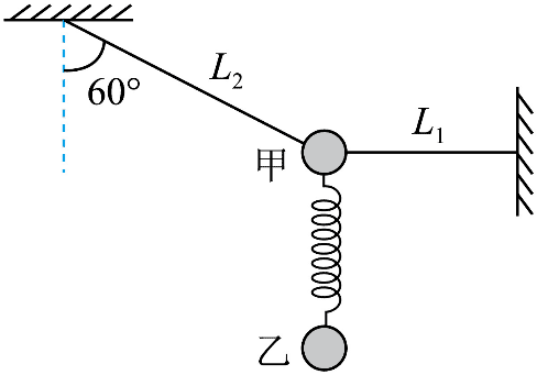 6.如图,质量均为 m 的两个相同小球甲和乙用轻弹簧连接,并用轻绳 L1、L2 固定,处于静止状态,L1 水平,L2 与竖直方向的夹角为 60°,重力加速度大小为 g。则( )