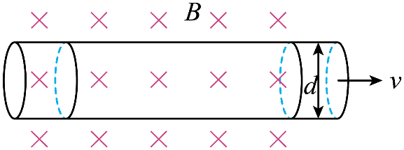 7.人体血管状况及血液流速可以反映身体健康状态。血管中的血液通常含有大量的正负离子。如图,血管内径为 d,血流速度 v 方向水平向右。现将方向与血管横截面平行,且垂直纸面向内的匀强磁场施于某段血管,其磁感应强度大小恒为 B,当血液的流量(单位时间内流过管道横截面的液体体积)一定时( )
