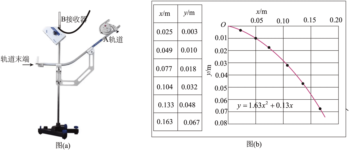 11.图(a)为研究平抛运动的实验装置,其中装置 A、B 固定在铁架台上,装置 B 装有接收器并与计算机连接。装有发射器的小球从装置 A 某高处沿着轨道向下运动,离开轨道时,装置 B 开始实时探测小球运动的位置变化。根据实验记录的数据由数表作图软件拟合出平抛运动曲线方程 y = 1.63x2 + 0.13x,如图(b)所示。