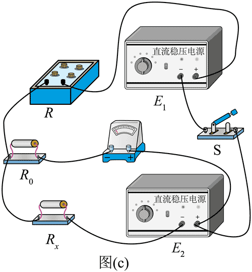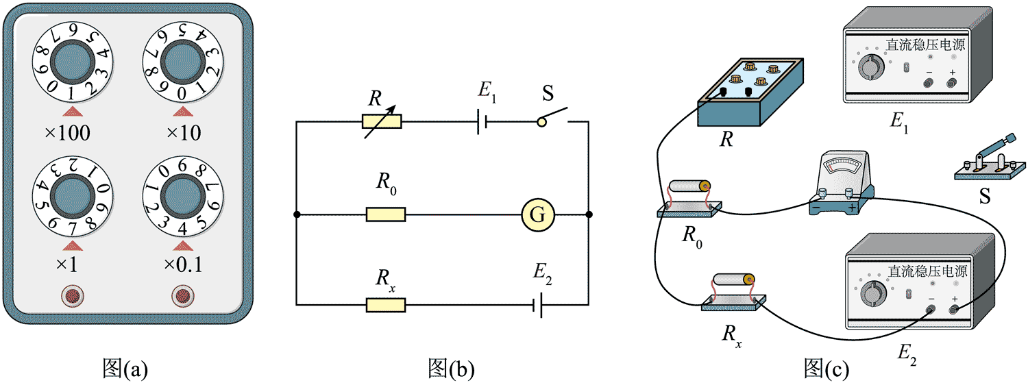 (3)如图(b)所示,Rx 为待测电阻,R0 为检流计(小量程电流表)的保护电阻,实验中直流稳压电源的输出电压始终保持不变。第一次测量时,按图(b)中电路图连接,闭合开关,调节电阻箱 R 使检流计示数为零,此时电阻箱读数为 R1,则通过电阻箱的电流_________(填“大于”“等于”或“小于”)通过待测电阻的电流;第二次测量时,将图(b)中电阻箱 R 与待测电阻 Rx 位置互换,闭合开关,再次调节电阻箱 R 使检流计示数为零,此时电阻箱读数为 R2;则待测电阻 Rx =_________。(结果用 R1、R2 表示)
