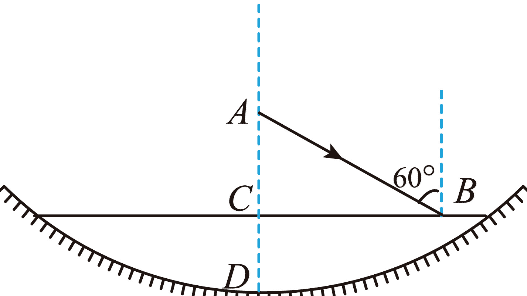 13.如图,半径为 R 的球面凹面镜内注有透明液体,将其静置在水平桌面上,液体中心厚度 CD 为 10 mm。一束单色激光自中心轴上距液面 15 mm 的 A 处以 60° 入射角射向液面 B 处,其折射光经凹面镜反射后沿原路返回,液体折射率为 \(\sqrt 3 \)。求: