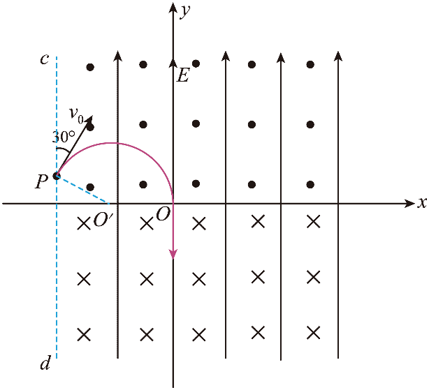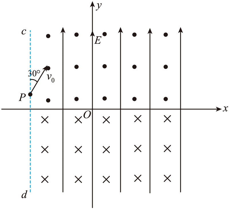 15.如图,cd 边界与 x 轴垂直,在其右方竖直平面内,第一、二象限存在垂直纸面向外的匀强磁场,第三、四象限存在垂直纸面向内的匀强磁场,磁场区域覆盖有竖直向上的外加匀强电场。在 xOy 平面内,某质量为 m、电荷量为 q 带正电的绝缘小球从 P 点与 cd 边界成 30° 角以速度 v0 射入,小球到坐标原点 O 时恰好以速度 v0 竖直向下运动,此时去掉外加的匀强电场。重力加速度大小为 g,已知磁感应强度大小均为 \(\frac{{mg}}{{q{v_0}}}\)。求: