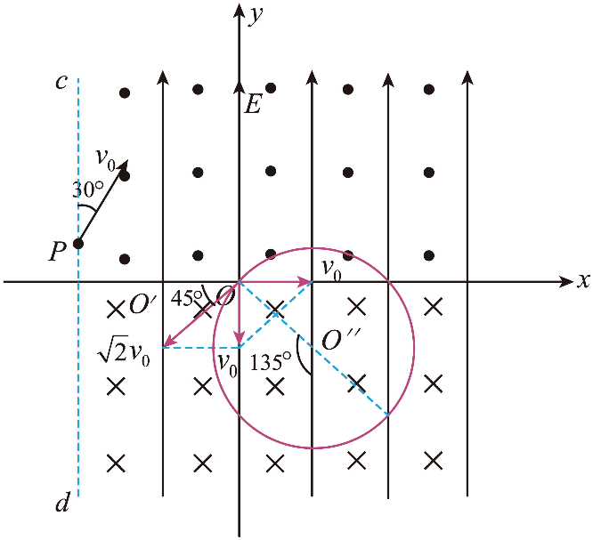 小球沿 x 轴正方向做匀速直线运动,与 x 轴负方向成 45° 的 \(\sqrt 2 \)v0 对应的洛伦兹力提供小球做逆时针匀速圆周运动的向心力,可知小球第一次到达最低点时速度的大小为