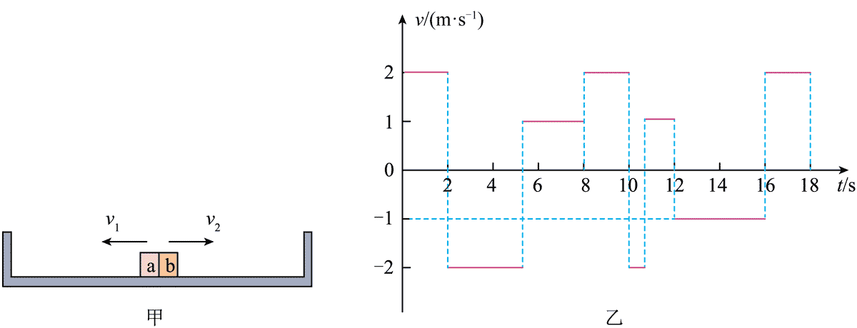 10.如图甲所示,内表面光滑的“⊔”形槽固定在水平地面上,完全相同的两物块 a、b(可视为质点)置于槽的底部中点,t = 0 时,a、b 分别以速度 v1、v2 向相反方向运动,已知 b 开始运动速度 v 随时间 t 的变化关系如图乙所示,所有的碰撞均视为弹性碰撞且碰撞时间极短,下列说法正确的是( )