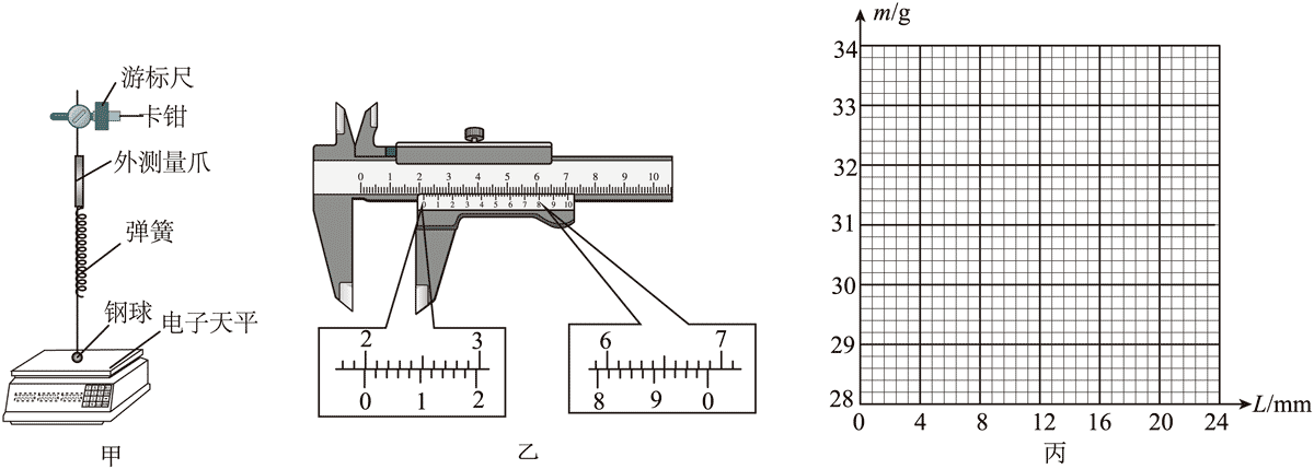 ⑤缓慢向下拉动尺身,改变电子天平的示数 m,m 每增加 1.00 g,拧紧游标尺紧固螺钉,读出对应的游标卡尺读数 L,在表格中记录实验数据。
