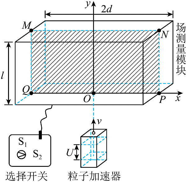 带电粒子经粒子加速器加速后可从 O点沿 y 轴正方向射入。选择开关拨到 S1 挡可在模块内开启垂直于 Oxy 平面的待测匀强磁场,长为 2d 的 PQ 区间标有刻度线用于表征磁感应强度的大小和方向;拨到 S2 可在模块内开启平行于 x 轴的待测匀强电场,长为 l 的 NP 和 QM 区间 (l > \(\frac{d}{2}\))标有刻度线用于表征电场强度的大小和方向。带电粒子以速度 v 入射,其质量为 m、电荷量为 + q,带电粒子对待测场的影响和所受重力忽略不计。
