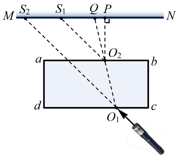 ②用激光笔以一定角度照射玻璃砖,记录入射点 O1 和屏上光点 S1 的位置。