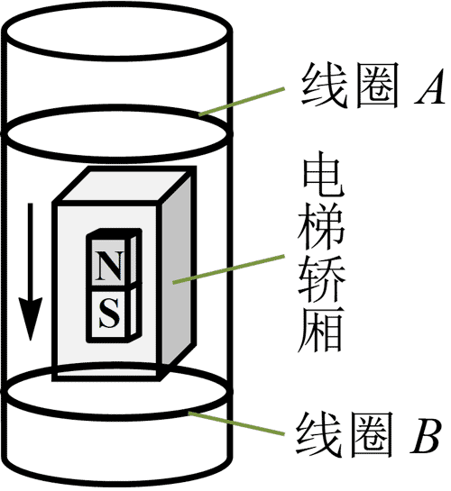 3.如图,某学习小组设计一款防止电梯突然加速坠落的应急安全装置。在电梯轿厢上安装永久磁铁,井壁固定水平方向的闭合线圈 A、B,电梯突然坠落时可起到缓冲的作用。当电梯坠至图示位置时( )