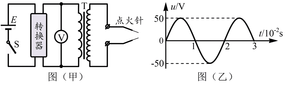 4.(多选)图(甲)为家用燃气灶点火装置电路图。转换器将直流电转换为图(乙)所示的正弦交流电,再与理想变压器连接,变压器副线圈与原线圈的匝数比为 k。当两个点火针之间的电压瞬间大于 5000 V 时,就会产生火花,点燃燃气。下列说法正确的是( )