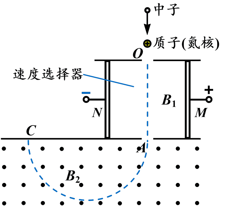 3.查德威克将这种未知粒子与多种原子核碰撞,重做实验,借助质谱仪测量并算出该未知粒子的质量十分接近质子的质量,与卢瑟福“中子”预言吻合。质谱仪的测量原理如图所示,速度选择器的两金属板 M、N 间距为 d,板间区域磁场的磁感应强度大小为 B1。中子与静止的质子发生弹性正碰后,质子由 O 处进入,当板间电压为 U0 时,恰能沿直线经过正下方的 A 孔垂直于磁场方向射入磁感应强度大小为 B2、垂直纸面向外的匀强磁场中,最后打在照相底片上的 C 点,测出 AC 长度为 L,元电荷为 e,不计重力影响。