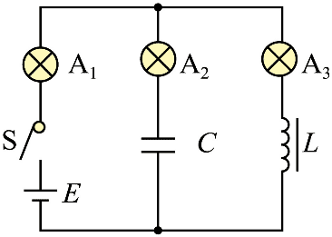 9.如图所示,线圈自感系数为 L,电容器电容为 C,电源电动势为 E,A1、A2 和 A3 是三个相同的小灯泡。开始时,开关 S 处于断开状态。忽略线圈电阻和电源内阻,将开关 S 闭合,下列说法正确的是 ( )