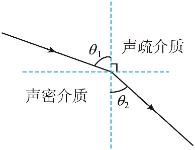 声音的传播类比光线传播,即类比光线的折射率;若空气中的温度均匀,从 S 发出的光线应该向四周沿直线传播,题目中“声线”向地面传播的过程中,越来越靠近法线,即 θ1 > θ2,因此越靠近地面空气对声音的折射率 n 越大,类比光在介质中传播的速度 v = \(\frac{c}{n}\) 可知折射率越大,光速越小,因此声音越靠近地面,声速越小,温度越低。