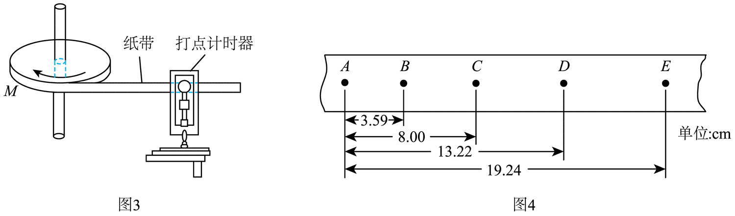 (4)某同学用打点计时器来研究圆周运动。如图 3 所示,将纸带的一端固定在圆盘边缘处的 M 点,另一端穿过打点计时器。实验时圆盘从静止开始转动,选取部分纸带如图 4 所示。相邻计数点间的时间间隔为 0.10 s,圆盘半径 R = 0.10 m。则这部分纸带通过打点计时器的加速度大小为________m/s2;打点计时器打 B 点时圆盘上 M 点的向心加速度大小为________ m/s2。(结果均保留两位有效数字)