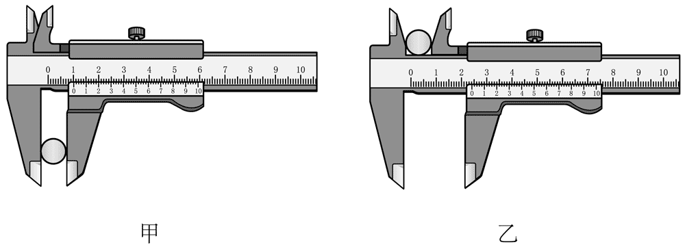 (2)测量小球直径的正确操作需要确保测量工具与小球接触良好,并且小球的位置不会导致测量误差。在图中的情形中,甲图示显示出的卡尺测量方式更准确地使卡尺的两测量面与小球的表面垂直接触,适合测量直径。而乙图因为夹持不住小球,使得小球并没有夹在量爪之间,测量不准确。