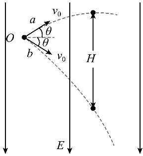 13.如图所示,在电场强度为 E,方向竖直向下的匀强电场中,两个相同的带正电粒子 a、b 同时从 O 点以初速度 v0 射出,速度方向与水平方向夹角均为 θ。已知粒子的质量为 m。电荷量为 q,不计重力及粒子间相互作用。求:
