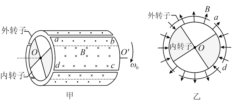 15.圆筒式磁力耦合器由内转子、外转子两部分组成。工作原理如图甲所示。内、外转子可绕中心轴 OO′ 转动。外转子半径为 r1,由四个相同的单匝线圈紧密围成,每个线圈的电阻均为 R,直边的长度均为 L,与轴线平行。内转子半径为 r2,由四个形状相同的永磁体组成,磁体产生径向磁场,线圈处的磁感应强度大小均为 B。外转子始终以角速度 ω0 匀速转动,某时刻线圈 abcd 的直边 ab 与 cd 处的磁场方向如图乙所示。