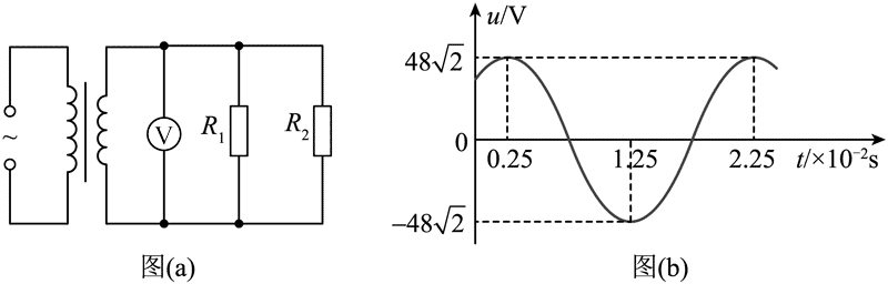 2.在图(a)所示电路中,理想变压器原、副线圈匝数比 4∶1,电阻 R1 的阻值为 R2 的 2 倍,电压表为理想电压表。若原线圈输入如图(b)所示的正弦交流电,则( )