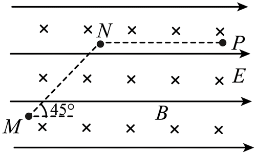 如图,真空中存在一水平向右的匀强电场,同时存在一水平且垂直纸面向里的匀强磁场。一质量为 m、电量为 q(q > 0)的带电微粒从 M 点以初速度 v 入射,沿着 MN 做匀速直线运动。微粒到 N 点时撤去磁场,一段时间后微粒运动到 P 点。已知 M、N、P 三点处于同一竖直平面内,MN 与水平方向呈 45°,N 点与 P 等高,重力加速度为 g,则( )