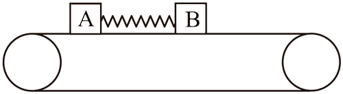 如图,物块 A、B 用轻弹簧连接并放置于水平传送带上,传送带以 1 m/s 的恒定速率顺时针转动。t = 0 时,A 的速度大小为 2 m/s,方向水平向右,B 的速度为 0,弹簧处于原长,t = t1 时(t1 为未知量),A 第一次与传送带共速,弹簧弹性势能 0.75 J。已知 A、B 可视为质点,质量分别为 1 kg、2 kg,与传送带的动摩擦因数为 0.5、0.25;A 与传送带相对滑动时会留下痕迹,重力加速度大小取 g = 10 m/s2,A、B 始终在传送带上,弹簧始终在弹性限度内,则( )