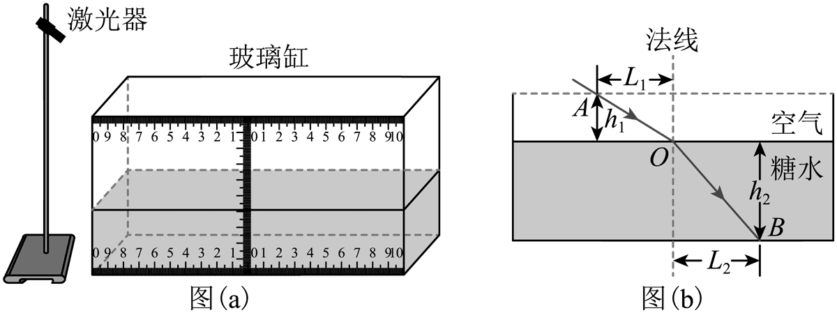 (3)调整激光器,使入射点 O 处于竖直刻度尺的正后方,光路如图(b)所示,其中 A 点是入射光线与玻璃缸上边沿所在平面的交点,B 点是折射光线与玻璃缸底部的交点,A、B 点到法线的距离分别为 L1、L2,到液面的距离分别为 h1、h2。测得 L1、L2、h1、h2 的值,并利用表达式 n =________(用 L1、L2、h1、h2 表示)求出糖水折射率。