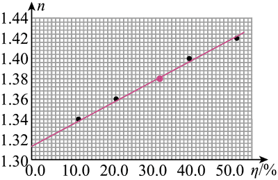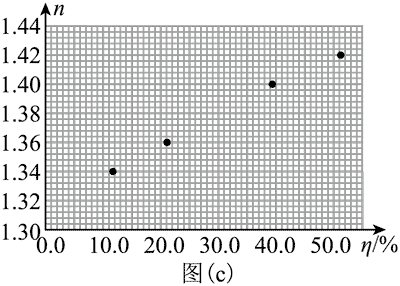 (5)在图(c)给出的坐标纸上补上浓度 η = 32% 的数据点。分析图中数据点,可知糖水折射率随浓度近似线性变化,绘制出“n–η”图线________。