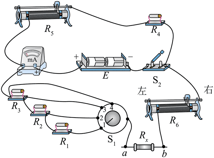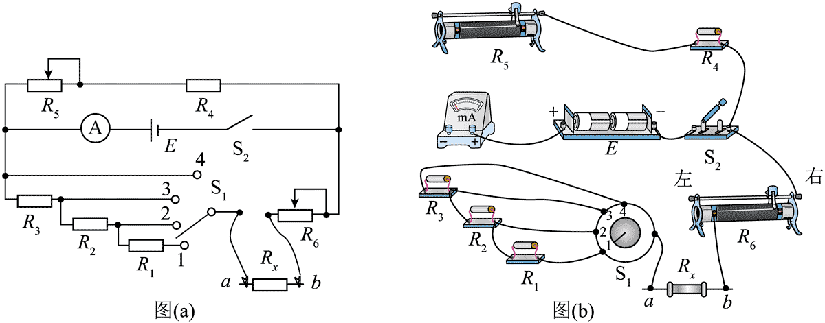 13.某实验小组基于“等效替代法”设计了如图(a)所示的电路用于电阻测量。使用的器材有:电源 E(电动势 3 V),电流表 A(量程 30 mA),定值电阻 R1、R2、R3(阻值均为 100 Ω),定值电阻 R4(阻值 200 Ω),滑动变阻器 R5(最大阻值 200 Ω,额定电流 1.5 A),带标尺的滑动变阻器 R6(最大阻值 100 Ω,额定电流 1.5 A),选择开关 S1,单刀开关 S2,待测电阻 Rx(阻值小于 400 Ω),导线若干。