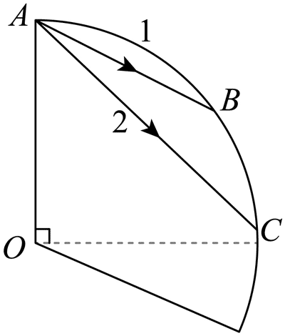 5.如图扇形的材料,折射率大于 \(\sqrt 2 \),现有两条光线 1 和 2,从扇形材料的A点传播,光线 1 传到圆弧(\(\frac{1}{4}\) 圆)AC 的中点 B,光线 2 传播到 C 点偏上,则两光线发生下列哪种情况( )