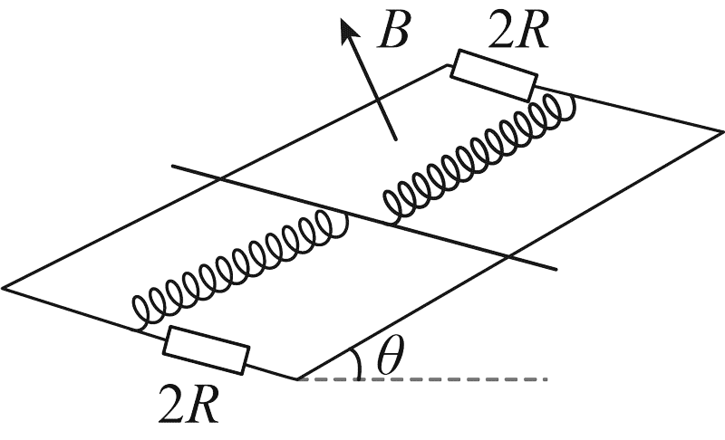 7.如图,两条固定的光滑平行金属导轨,所在平面与水平面夹角为 θ,间距为 l,导轨电阻忽略不计,两端各接一个阻值为 2R 的定值电阻,形成闭合回路:质量为 m 的金属棒垂直导轨放置,并与导轨接触良好,接入导轨之间的电阻为 R;劲度系数为 k 的两个完全相同的绝缘轻质弹簧与导轨平行,一端固定,另一端均与金属棒中间位置相连,弹簧的弹性势能 Ep 与形变量 x 的关系为 Ep = \(\frac{1}{2}\)kx2;将金属棒移至导轨中间位置时,两弹簧刚好处于原长状态;整个装置处于垂直导轨所在平面向上的匀强磁场中,磁感应强度大小为 B。将金属棒从导轨中间位置向上移动距离 a 后静止释放,金属棒沿导轨向下运动到最远处,用时为 t,最远处与导轨中间位置距离为 b,弹簧形变始终在弹性限度内。此过程中( )