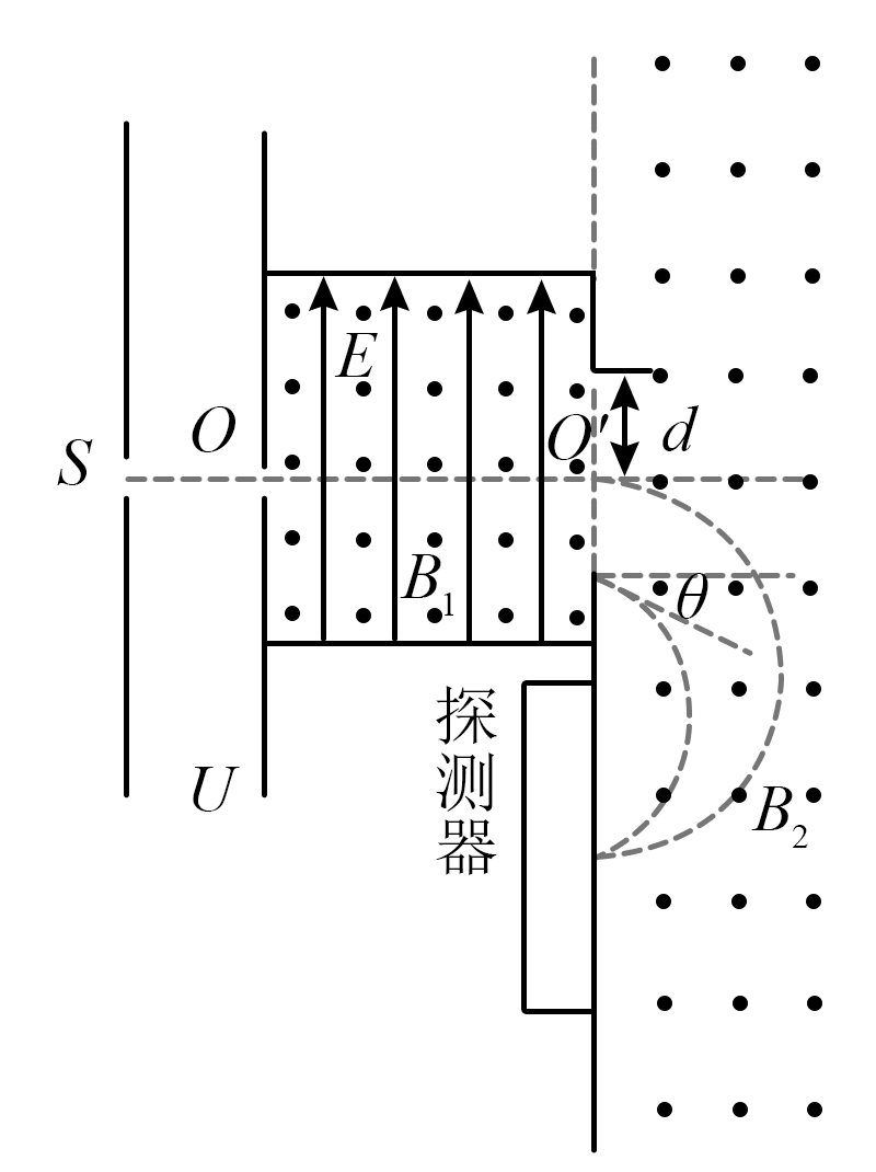 D.调节选择器,使N粒子沿轴线 OO′ 进入偏转磁场,打在探测器上的位置与调节前 M 粒子打在探测器上的位置间距为 \(\frac{{4U{B_1}}}{{E{B_2}}}\) + \(\frac{{(Ed{B_2} - 4U{B_1})\sqrt U }}{{E{B_2}\cos \theta \sqrt {U - Ed} }}\)