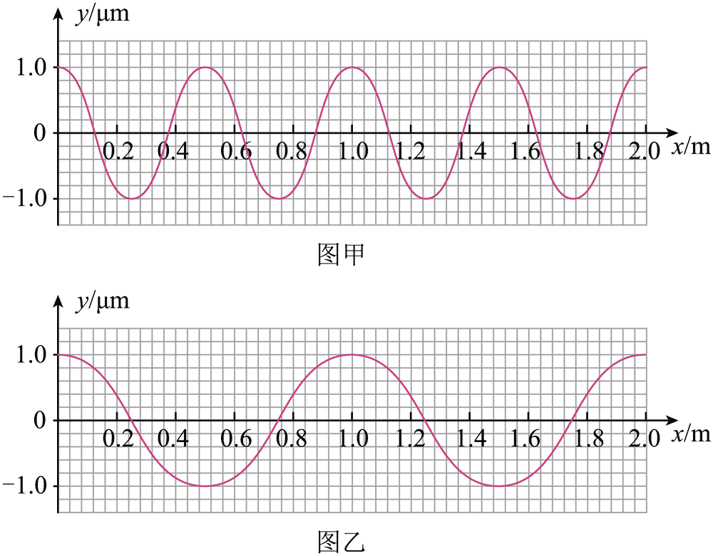 13.某乐器发出频率为两倍关系的两个纯音(简谐声波),其波形叠加后呈现一种周期性变化。图甲和图乙分别为同一时刻两列简谐声波单独沿 x 正方向传播的波形图,图中的坐标原点位于同一质点处,声速为 340 m/s。