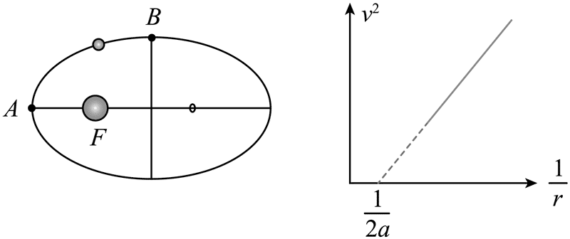 14.带电粒子绕着带电量为 + Q 的源电荷做轨迹为椭圆的曲线运动,源电荷固定在椭圆左焦点 F 上,带电粒子电量为 − q;已知椭圆焦距为 c,半长轴为 a,电势计算公式为 φ = \(\frac{{kQ}}{r}\),带电粒子速度的平方与其到电荷的距离的倒数满足如图关系。