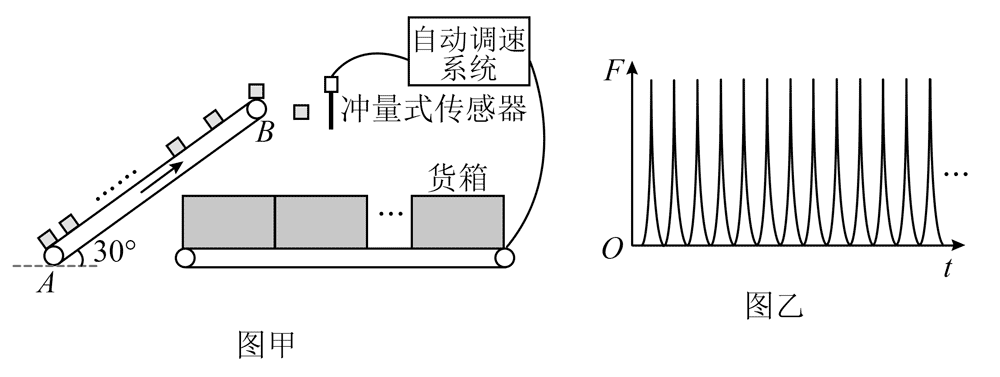 15.图甲为某智能分装系统工作原理示意图,每个散货经倾斜传送带由底端 A 运动到顶端 B 后水平抛出,撞击冲量式传感器使其输出一个脉冲信号,随后竖直掉入以与水平传送带共速度的货箱中,此系统利用传感器探测散货的质量,自动调节水平传送带的速度,实现按规格分装。倾斜传送带与水平地面夹角为 30°,以速度 v0 匀速运行。若以相同的时间间隔 Δt 将散货以几乎为 0 的速度放置在倾斜传送带底端 A,从放置某个散货时开始计数,当放置第 10 个散货时,第 1 个散货恰好被水平抛出。散货与倾斜传送带间的动摩擦因数 μ = \(\frac{{\sqrt 3 }}{2}\),到达顶端前已与传送带共速。设散货与传感器撞击时间极短,撞击后竖直方向速度不变,水平速度变为 0。每个长度为 d 的货箱装总质量为 M 的一批散货。若货箱之间无间隔,重力加速度为 g。分装系统稳定运行后,连续装货,某段时间传感器输出的每个脉冲信号与横轴所围面积为 I 如图乙,求这段时间内: