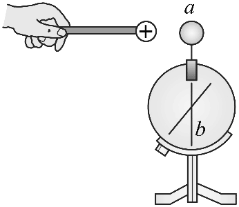 由图可知,验电器本来不带电,由于同种电荷相互排斥,异种电荷相互吸引,正金属球靠近不带电验电器金属小球 a,使得金属球 a 带负电荷,从而导致金属箔 b 带上正电荷。