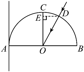 II.沿玻璃砖由 C 向 B 缓慢移动激光笔,使得入射光线平行纸面且始终沿着半径方向射向圆心 O,从玻璃砖射出的激光在 AB 下方,射在光屏上,当光屏上的光线恰好消失时,记下激光入射点 D。取走玻璃砖,过 D 点作 CO 的垂线 DE。