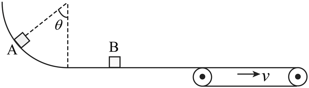 17.某自动包装系统的部分结构简化后如图所示,足够长的传送带固定在竖直平面内,半径 R = 0.5 m,圆心角 θ = 53° 的圆弧轨道与平台平滑连接,平台与顺时针匀速转动的水平传送带平滑连接,工件 A 从圆弧顶点无初速度下滑,在平台上滑入静止的空箱 B 并与其瞬间粘连成一个整体,随后一起滑上传送带,与传送带共速后进入下一道工序。已知工件 A 的质量 mA = 4 kg,空箱B的质量 mB = 1 kg,A、B 及粘连成的整体均可视为质点,整体与传送带间的动摩擦因数恒定,在传送带上运动的过程中因摩擦产生的热量 Q = 2.5 J,忽略轨道及平台的摩擦,cos53° = 0.6,重力加速度 g = 10 m/s2。求: