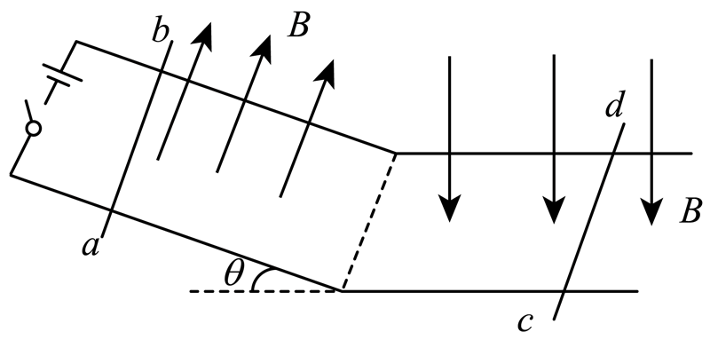 18.间距为 L 的金属导轨倾斜部分光滑,水平部分粗糙且平滑相接,导轨上方接有电源和开关,倾斜导轨与水平面夹角 θ = 30°,处于垂直于导轨平面向上的匀强磁场中,水平导轨处于竖直向下的匀强磁场中,磁感应强度大小均为 B,两相同导体棒 ab、cd 与水平导轨的动摩擦因数 μ = 0.25,最大静摩擦力等于滑动摩擦力,两棒质量均 m,接入电路中的电阻均为 R,cd 棒仅在水平导轨上运动,两导体棒在运动过程中始终与导轨垂直并接触良好,且不互相碰撞,忽略金属导轨的电阻,重力加速度为 g。