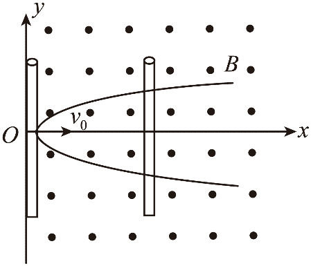 9.如图,关于 x 轴对称的光滑导轨固定在水平面内,导轨形状为抛物线,顶点位于 O 点。一足够长的金属杆初始位置与 y 轴重合,金属杆的质量为 m,单位长度的电阻为 r0。整个空间存在竖直向上的匀强磁场,磁感应强度为 B。现给金属杆一沿 x 轴正方向的初速度 v0,金属杆运动过程中始终与 y 轴平行,且与电阻不计的导轨接触良好。下列说法正确的是( )