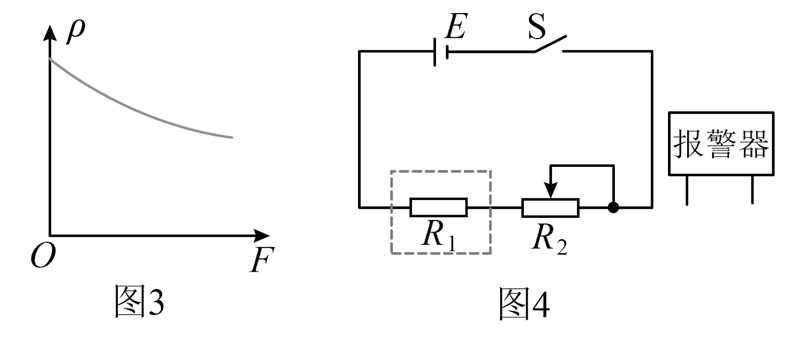 (5)基于以上结论,设计压力报警系统,电路如图 4 所示。报警器在两端电压大于或等于 3 V 时启动,R1 为水泥块,R2 为滑动变阻器,当 R2 的滑片处于某位置,R1 上压力大于或等于 F0 时,报警器启动。报警器应并联在__________两端(填“R1”或“R2”)。